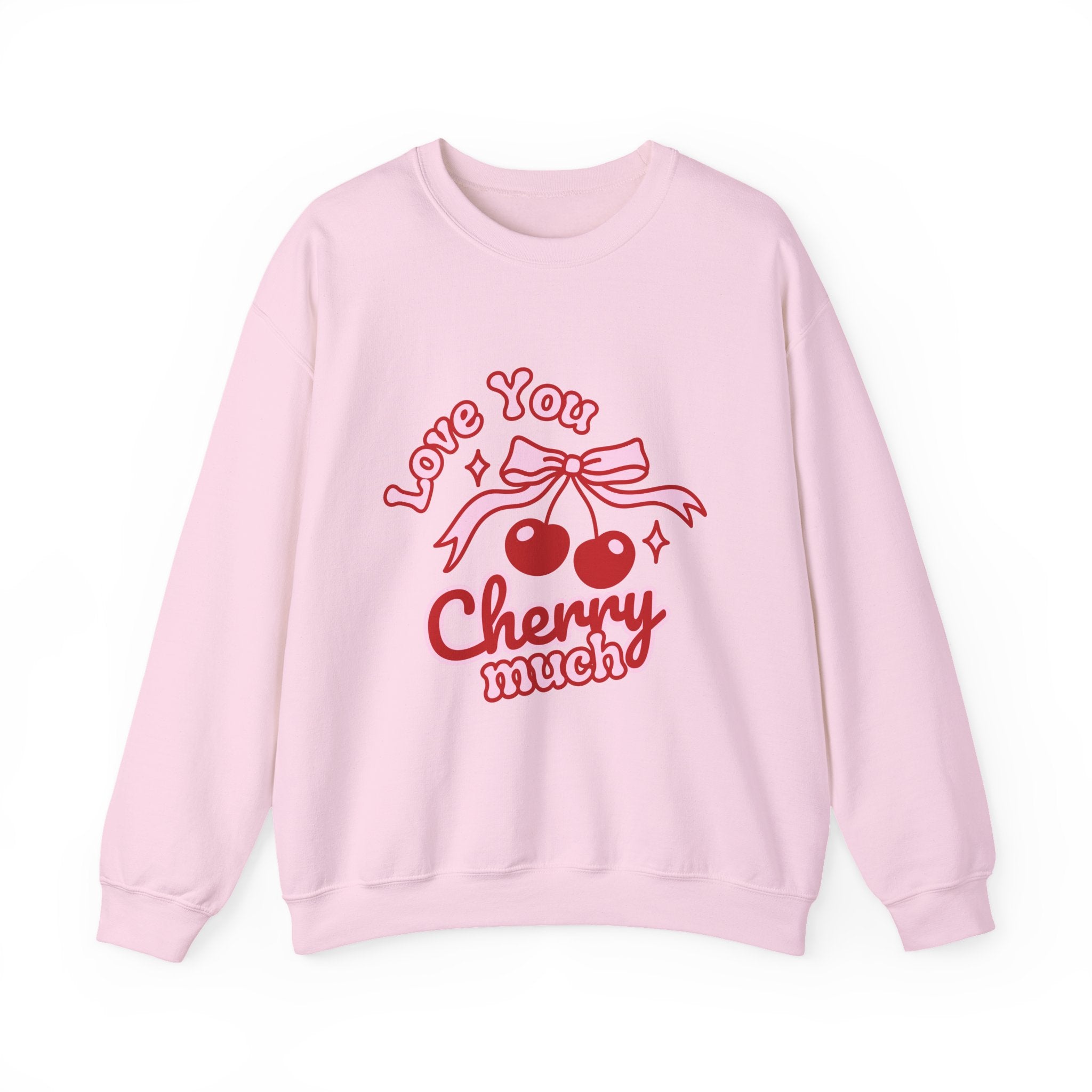 Soft, cozy, and a little nostalgic — this crewneck brings playful cherry graphics and warm comfort together. The front features a sweet pink-and-red illustration with two cherries, a bow, and the phrase “Love You Cherry Much,” giving the sweatshirt a whimsical, retro-inspired vibe. Knit without side seams for a clean drape, it’s midweight and structured enough to layer over tees or under a jacket. Thoughtful details — like ribbed collar and durable double-needle stitching — keep this sweatshirt looking fresh through repeated wear. The inner labels and wrist prints use DTF printing for a smooth, low-profile finish, and the garment is produced with OEKO-TEX certified dyes and ethically sourced US cotton.