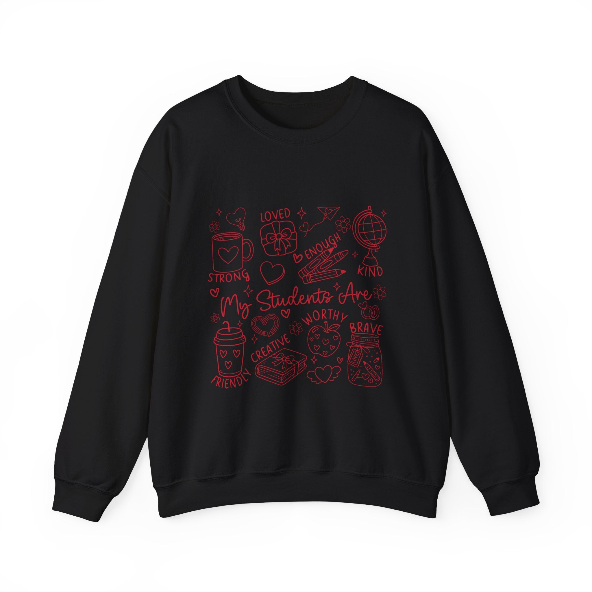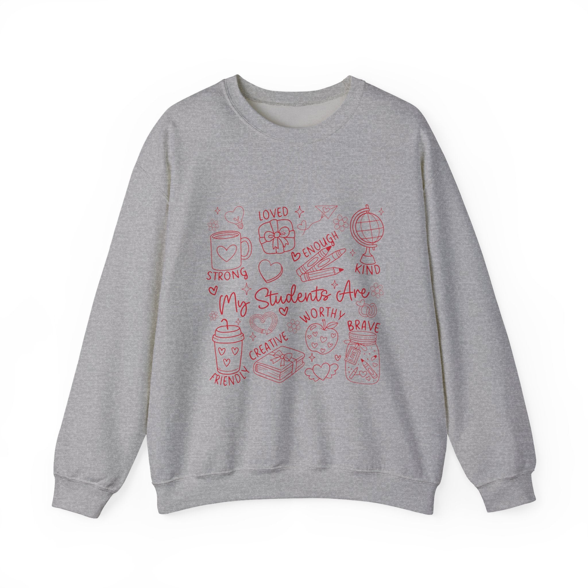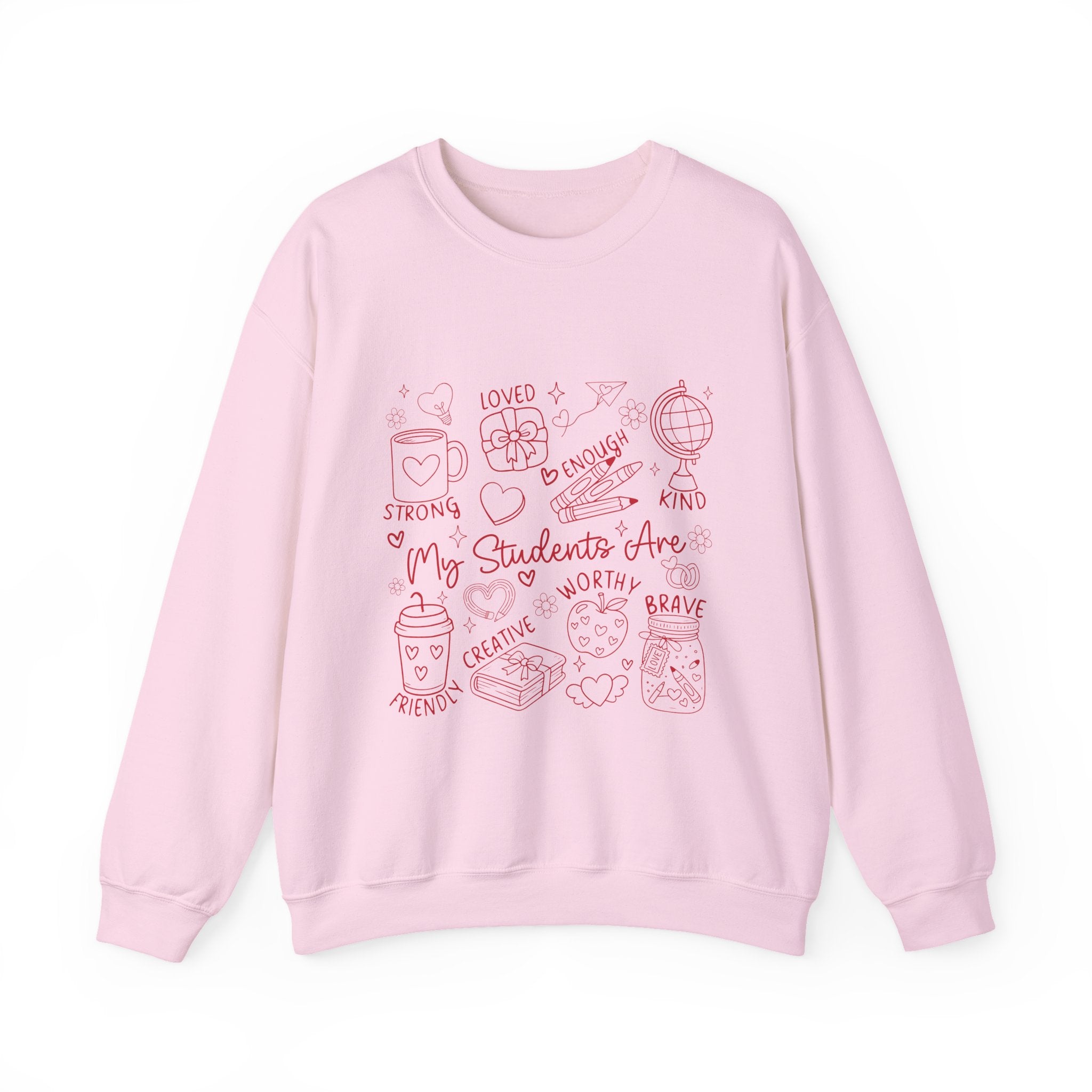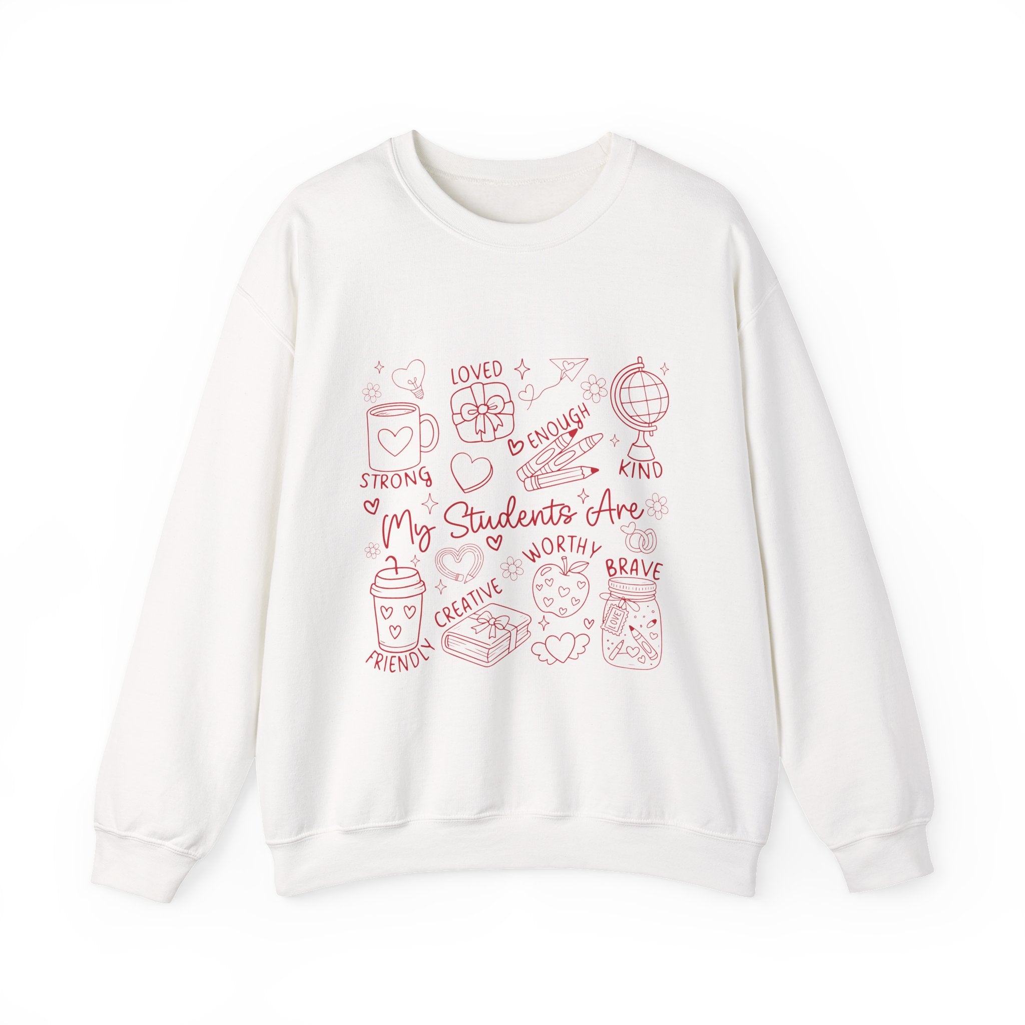 A cozy, warmly illustrated sweatshirt that reads like a classroom love letter. Soft white fleece carries a hand-drawn cluster of school-themed doodles and gentle affirmations in dusty rose—coffee cup, globe, books, apple, and tiny hearts—arranged around the phrase “My Students Are…”. Wear it on slow mornings, parent-teacher nights, or after-school grading sessions. The relaxed crew silhouette and midweight cotton-blend feel like a reassuring hug after a long day of lessons. Subtle embroidery placement options let you add a stitched name or small motif to the chest or wrists for a personal touch. Ethically sourced cotton, sturdy double-needle construction, and thoughtful tear-away labeling make this sweatshirt comfortable to wear and built to last.